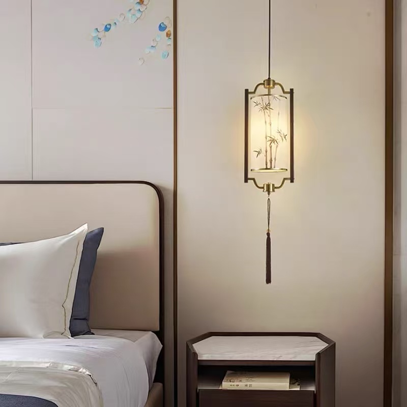 材质:实木吸顶盘 水转木纹灯体 竹子图案 柔光灯罩